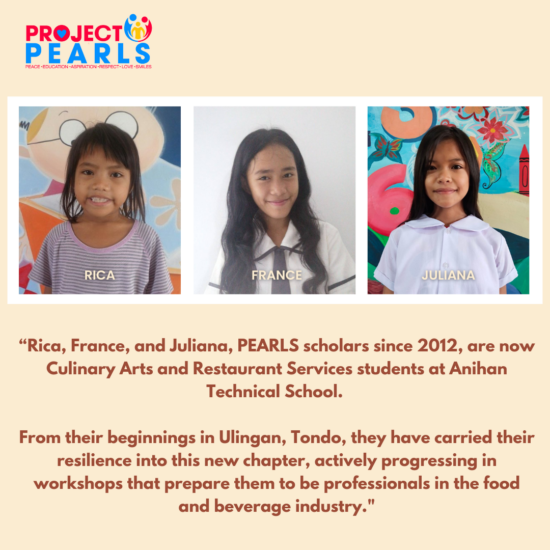 Eleven years ago, three young girls from Ulingan, Tondo became PEARLS scholars. Since 2012, we have watched Rica, France, and Juliana grow—not just in school, but through every workshop, training, and life lesson. They faced hardships early on, but they never let it dim their spark.